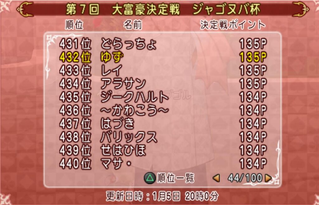 ドラクエ #大富豪 【大富豪】ジャゴヌバ杯 #2 2025年1月6日 2025年1月6日 51秒 今日は仕事が休みだったので大富豪の続きを。 今日は調子が連勝が続き、50pまで下がってたポイントが135pまで行きました✨ めちゃ嬉しいw 順位も432位まで上がったので1000位入賞はいけそうな気がしますね~ 13日まであるので油断せずに行きたいと思います~ ホロライブの五目並べ配信と4期生ライブもあり、 大富豪しながら楽しむことができましたw 最近ホロライブも沼ってるw 来週から本格的に仕事が始まってきますので頑張りたいと思います✨